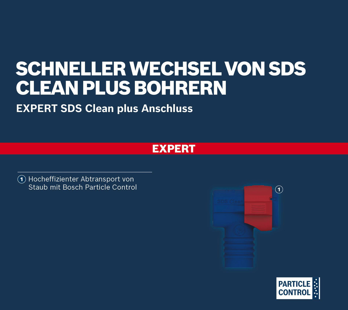 Schneller Wechsel von SDS Clean plus Bohrern! Auch beim staubfreien Bohren von Löchern für Dübel möchtest du die Bohrer schnell wechseln können. Wir haben den EXPERT SDS Clean plus Anschluss so entworfen, dass dies möglich ist. Der Anschluss passt auf alle EXPERT SDS Clean plus Bohrer und ermöglicht den Austausch abgenutzter Bohrer mit wenigen Klicks. So kannst du deine Bohrarbeiten schneller erledigen, bohrst saubere Löcher und hast weniger Staub in deiner Atemluft. Der EXPERT SDS Clean plus Anschluss erleichtert das Bohren in Beton. Das Einsetzen und Entfernen der EXPERT SDS Clean plus Bohrer ist schnell und unkompliziert. Der Anschluss funktioniert mit den meisten Staubabsaugungen. Er hat eine lange Lebensdauer (ca. 5x länger als die eines Bohrers), ist dabei aber kompakt und klein, beansprucht also nur wenig Platz im Werkzeugkasten. Hocheffizienter Abtransport von Staub mit Bosch Particle Control