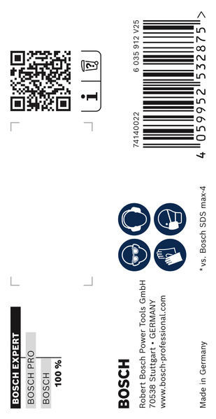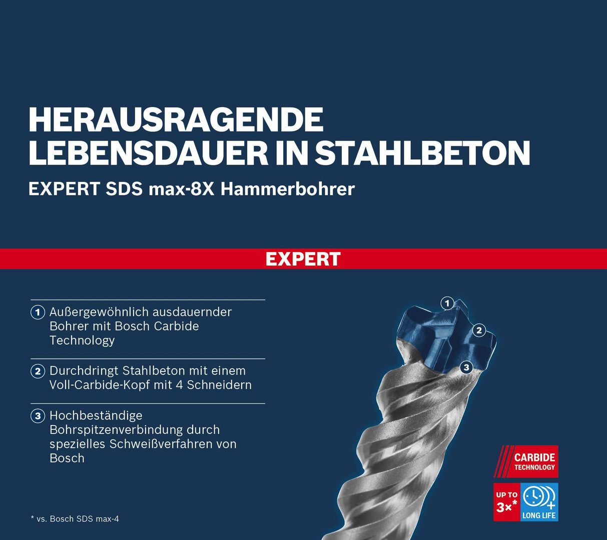 Herausragende Lebensdauer in Stahlbeton! Durchdringt Stahlbeton mit einem Voll-Carbide-Kopf mit 4 Schneidern Das Bohren durch Stahlbeton ist eine schwierige Aufgabe, die den Hammerbohrern viel abverlangt. Sogar 4-Schneider nutzen sich schnell ab. Beim Wechseln des Zubehörs und beim Kaufen von Verbrauchsmaterialien kommt es zu Ausfallzeiten. Der Vollhartmetallkopf auf dem EXPERT SDS max-8X ist ein fortschrittlicher 4-Schneider, der aus einem einzigen Stück des härtesten Metalls besteht: Es verklemmt nicht und zeigt keine Schwäche beim Hammerbohren. Für Bauprofis, die regelmäßig Beton und Stahlbeton bohren, z. B. für schwere Anker oder Armierungsverlängerungen. Der Bosch EXPERT SDS max-8X Hammerbohrer bietet eine unvergleichliche Leistung, Zuverlässigkeit und Langlebigkeit. Es ist das ideale EXPERT Zubehör für SDS max Bohrhämmer. Außergewöhnlich ausdauernder Bohrer mit Bosch Carbide Technology