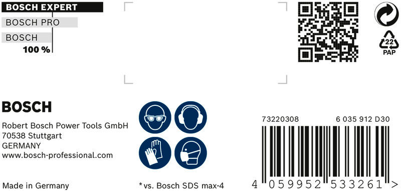 Herausragende Lebensdauer in Stahlbeton! Durchdringt Stahlbeton mit einem Voll-Carbide-Kopf mit 4 Schneidern Das Bohren durch Stahlbeton ist eine schwierige Aufgabe, die den Hammerbohrern viel abverlangt. Sogar 4-Schneider nutzen sich schnell ab. Beim Wechseln des Zubehörs und beim Kaufen von Verbrauchsmaterialien kommt es zu Ausfallzeiten. Der Vollhartmetallkopf auf dem EXPERT SDS max-8X ist ein fortschrittlicher 4-Schneider, der aus einem einzigen Stück des härtesten Metalls besteht: Es verklemmt nicht und zeigt keine Schwäche beim Hammerbohren. Für Bauprofis, die regelmäßig Beton und Stahlbeton bohren, z. B. für schwere Anker oder Armierungsverlängerungen. Der Bosch EXPERT SDS max-8X Hammerbohrer bietet eine unvergleichliche Leistung, Zuverlässigkeit und Langlebigkeit. Es ist das ideale EXPERT Zubehör für SDS max Bohrhämmer. Außergewöhnlich ausdauernder Bohrer mit Bosch Carbide Technology