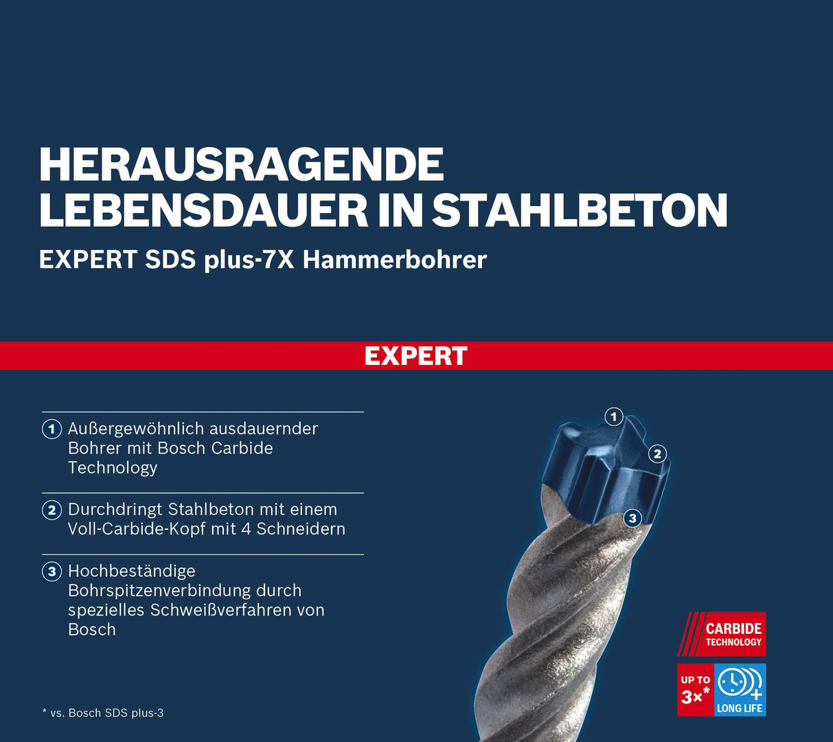 Herausragende Lebensdauer in Stahlbeton! Durchdringt Stahlbeton mit einem Voll-Carbide-Kopf mit 4 Schneidern Das Bohren durch Stahlbeton ist eine schwierige Aufgabe, die den Bohrern viel abverlangt. Normale Bohrer mit zwei Schneidekanten bleiben in der Armierung stecken und brechen ab. Der Vollhartmetallkopf auf dem EXPERT SDS plus-7X ist ein fortschrittlicher 4-Schneider, der aus einem einzigen Stück des härtesten Metalls besteht: Es verklemmt nicht und zeigt keine Schwäche beim Hammerbohren. Für Bauprofis, die regelmäßig in Beton und Stahlbeton bohren, beispielsweise für Bohrungen und Installationen. Der Bosch EXPERT SDS plus-7X Hammerbohrer bietet unvergleichliche Leistung, Zuverlässigkeit und Langlebigkeit. Es ist DAS EXPERTen-Zubehör für SDS plus Bohrhämmer. Außergewöhnlich ausdauernder Bohrer mit Bosch Carbide Technology