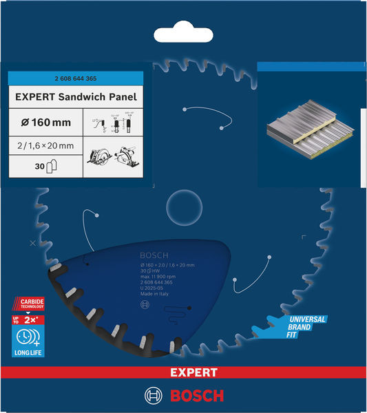 Lange Lebensdauer in Sandwich-Metallplatten! Zusätzliche Beschichtung für mehr Leistung und längere Haltbarkeit Wer auf einer industriellen Baustelle arbeitet, schneidet täglich Sandwich-Metallplatten. Dieser Werkstoff ist die Herausforderung für jedes Sägeblatt und macht Standard-Sägeblätter schnell stumpf. Aber nicht das EXPERT Sandwich Panel Kreissägeblatt. Mit unserem Kreissägeblatt können Sie sehr viele Sandwichplatten sauber schneiden. Die feinen Zähne des EXPERT Sandwich Panel sind scharf geschliffen und wurden mit der Bosch Carbide Technology hergestellt. Dadurch ist es sehr langlebig und ermöglicht saubere, präzise Schnitte. Zum Schutz vor Wärmestau und Korrosion haben wir es mit einer zusätzlichen Beschichtung versehen. Außergewöhnlich robust dank Bosch Carbide Technology