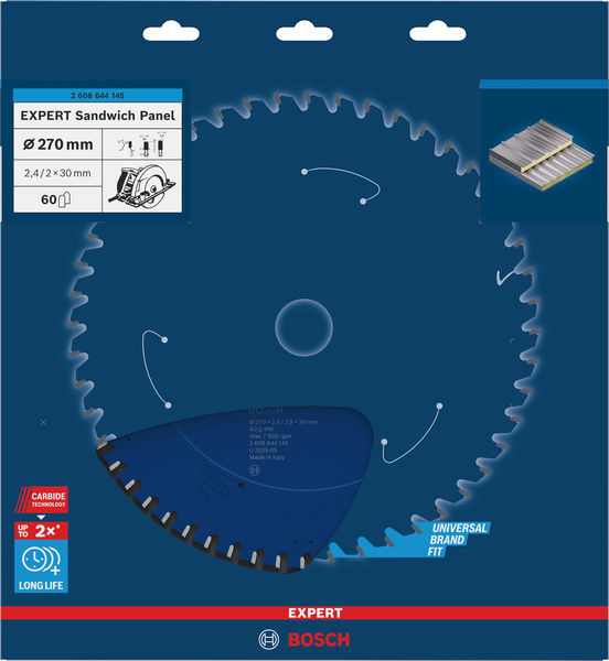 Lange Lebensdauer in Sandwich-Metallplatten! Zusätzliche Beschichtung für mehr Leistung und längere Haltbarkeit Wer auf einer industriellen Baustelle arbeitet, schneidet täglich Sandwich-Metallplatten. Dieser Werkstoff ist die Herausforderung für jedes Sägeblatt und macht Standard-Sägeblätter schnell stumpf. Aber nicht das EXPERT Sandwich Panel Kreissägeblatt. Mit unserem Kreissägeblatt können Sie sehr viele Sandwichplatten sauber schneiden. Die feinen Zähne des EXPERT Sandwich Panel sind scharf geschliffen und wurden mit der Bosch Carbide Technology hergestellt. Dadurch ist es sehr langlebig und ermöglicht saubere, präzise Schnitte. Zum Schutz vor Wärmestau und Korrosion haben wir es mit einer zusätzlichen Beschichtung versehen. Außergewöhnlich robust dank Bosch Carbide Technology