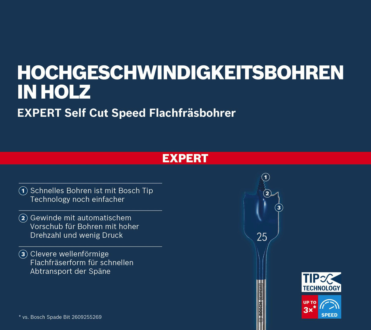 Hochgeschwindigkeitsbohren in Holz! Gewinde mit automatischem Vorschub für Bohren mit hoher Drehzahl und wenig Druck Flachfräsbohrer sind ein großartiges Zubehör für Elektriker und andere Installateure und Bauarbeiter. Was wäre, wenn sie noch schneller und effizienter sein könnten? Mit der Bosch Tip Technology ist dies möglich. Der Bosch EXPERT Self Cut Speed Flachfräsbohrer eignet sich für alle Arten von Weichholz und bietet Effizienz und Komfort für Experten, die Löcher für Kabel, Rohre und andere Installationen bohren müssen. Schnelles Bohren ist mit Bosch Tip Technology noch einfacher