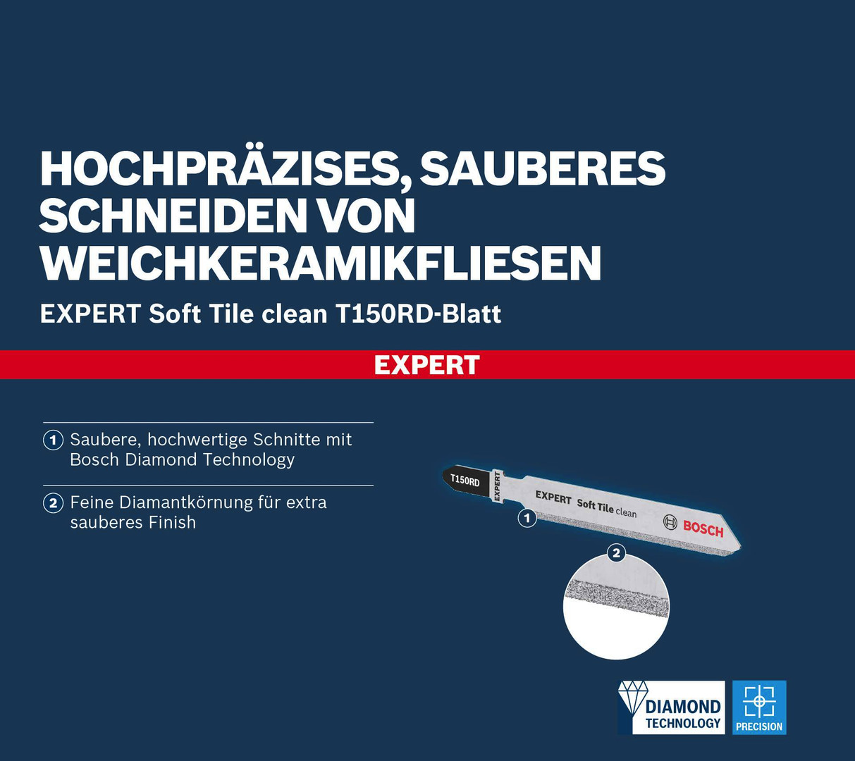 Hochpräzises, sauberes Schneiden von Weichkeramikfliesen! Feine Diamantkörnung für extra sauberes Finish Manchmal muss man feine Anpassungsschnitte an einer Wandfliese vornehmen, und ein Winkelschleifer ist für diese Arbeit einfach zu grob. Mit dem EXPERT Soft Tile clean T150RD kannst du eine Stichsäge nutzen, die Feinsteuerung und Präzision bietet. Wenn Du dich gefragt hast, wie Du mit einem Winkelschleifer feine, präzise Schnitte in Fliesen ausführen kannst, haben wir jetzt die Antwort. Das EXPERT T150RD Soft Tile clean Stichsägeblatt bietet spanfreies Schneiden für höchste Verarbeitungsqualität. Nicht geeignet zum Schneiden von harten Fliesen. Saubere, hochwertige Schnitte mit Bosch Diamond Technology