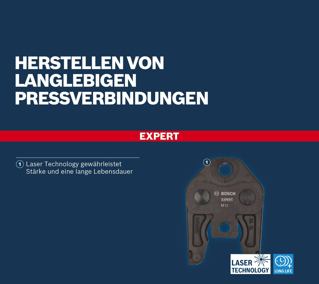 Herstellen von langlebigen Pressverbindungen! Rost, Verschleiß und eine verformte Profilgeometrie können Pressbacken beschädigen und das Herstellen sicherer Verbindungen verhindern. Wir haben die EXPERT Standard Pressbacke verschleißfest gemacht, damit du Pressfugen in allen Sanitärrohren sicher verpressen kannst. Die EXPERT Standard Pressbacke ist eine großartige Wahl für Klempner, die Presswerkzeuge zum Herstellen von Pressverbindungen an verschiedensten Arten von Sanitärrohren verwenden. Der Kopf des Presswerkzeugs ist aus Stahl gefertigt, der einer Kraft von 32 kN standhalten kann. Bei der Fertigung verwenden wir Stahl, der einer Laserhärtung unterzogen wird, was die Pressbacke verschleißfest und langlebig macht. Laser Technology gewährleistet Stärke und eine lange Lebensdauer