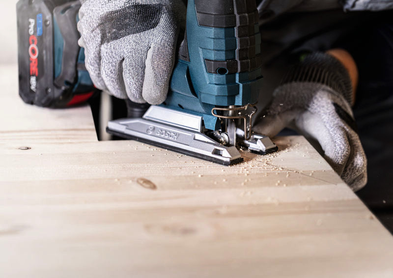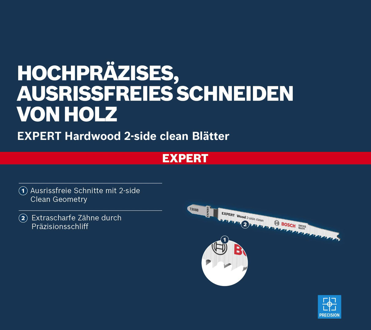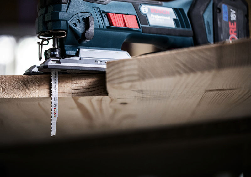 Hochpräzises, ausrissfreies Schneiden von Holz! Extrascharfe Zähne durch Präzisionsschliff Unter Tischlern und Schreinern war es schon immer eine Kunst sicherzustellen, dass der sichtbare Teil des Arbeitsmaterials die saubere Seite eines Stichsägenschnitts zeigt. Manchmal muss man das Werkstück zum Sägen umdrehen. Oder die Stichsäge sägt von der Rückseite, um die gewünschte Schnittqualität auf der Sichtseite zu haben. Oder du verwendest das EXPERT Wood 2-side clean-Blatt, das dank seiner Zahngeometrie auf beiden Seiten einen perfekten, ausrissfreien Schnitt bietet. Mit seinen besonders scharfen, präzisionsgeschliffenen Zähnen eignet sich das Bosch EXPERT Wood 2-side clean-Stichsägeblatt gut zum Schneiden von Weichholz mit einer Dicke von bis zu 50 mm. Möbelschreiner können ein perfektes Ergebnis erzielen und verlieren nicht nach jedem Stichsägenschnitt Zeit durch Schleifen. Erhältlich für gerade Schnitte (T308B), für Kurvenschnitte (T308BO) und für genaue Winkelschnitte (T308BP). Ausrissfreie Schnitte mit 2-side Clean Geometry
