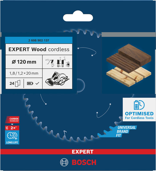 Herausragende Lebensdauer in Holz! Extradünne Schnittfuge und lange Akkulaufzeit Wenn du auf der Baustelle Balken, Bretter, Holzplatten, Latten, Dachlatten oder andere Holz- oder holzbasierte Werkstoffe schneiden musst, ist eine Handkreissäge in der Regel dein bevorzugtes Werkzeug. Wir haben die EXPERT Wood cordless entwickelt, damit du deine Arbeit mit Leichtigkeit erledigen kannst solange der Akku hält. Die feinen Zähne des EXPERT Wood cordless sind scharf geschliffen und wurden mit der Bosch Carbide Technology hergestellt. Dadurch macht es saubere und präzise Schnitte, zudem ist es robuster und hält länger als jedes andere Kreissägeblatt für Holz in unserem Portfolio. Zum Schutz vor Wärme und Korrosion haben wir es mit einer zusätzlichen Beschichtung versehen. Die extra dünne Schnittfuge reduziert die Reibung und sorgt dafür, dass deine Kreissäge weniger Energie verbraucht, sodass du länger mit einer Akkuladung arbeiten kannst. Außergewöhnlich robust dank Bosch Carbide Technology