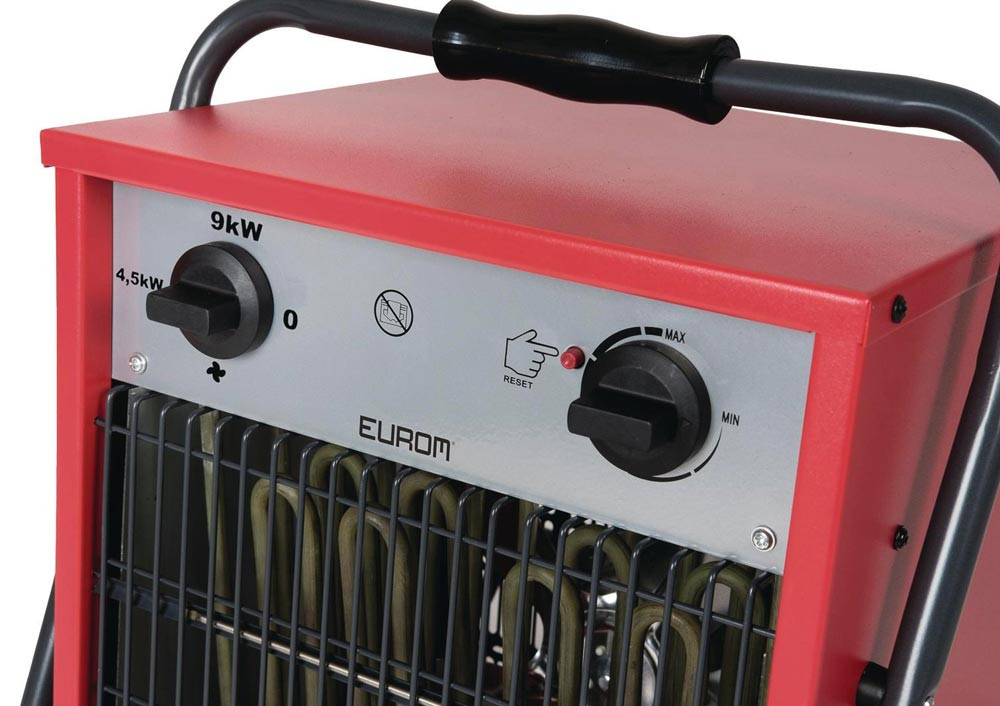 elektrische 400-V-Heizlüfterheizung · für den Einsatz in Werkstätten, Schuppen und Garagen · 9000 Watt · mit Kaltluftventilator und Thermostat · spritzwassergeschützt · robustes Metallgehäuse · Überhitzungsschutz · mit Nachkühlfunktion