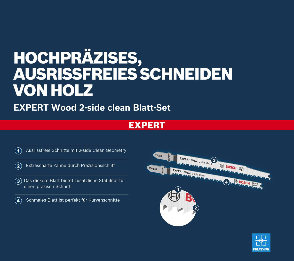 Hochpräzises, ausrissfreies Schneiden von Holz! Extrascharfe Zähne durch Präzisionsschliff Die saubere Seite eines Stichsägeschnitts auf der sichtbaren Seite des Werkstücks zu gewährleisten, ist seit jeher eine Kunst für Tischler und Schreiner. Manchmal muss man das Werkstück zum Sägen umdrehen. Oder die Stichsäge sägt von der Rückseite, um die gewünschte Schnittqualität auf der Sichtseite zu haben. Oder Du verwendest die Stichsägeblätter aus dem EXPERT Wood Set. Dank ihrer doppelten Zahnreihe ermöglichen sie einen perfekten, ausrissfreien Schnitt auf beiden Seiten. Mit ihren extra scharfen, präzisionsgeschliffenen Zähnen eignen sich die Bosch EXPERT Wood Stichsägeblätter hervorragend zum Schneiden von Weichholz bis zu einer Dicke von 50 mm. Möbelschreiner können ein perfektes Ergebnis erzielen und verlieren nicht nach jedem Stichsägeschnitt Zeit durch Schleifen. Mit den Stichsägeblättern aus dem Set kannst Du gerade Schnitte (T308B), Kurvenschnitte (T308BO) und präzise Winkelschnitte (T308BP) ausführen. Ausrissfreie Schnitte mit 2-side Clean Geometry