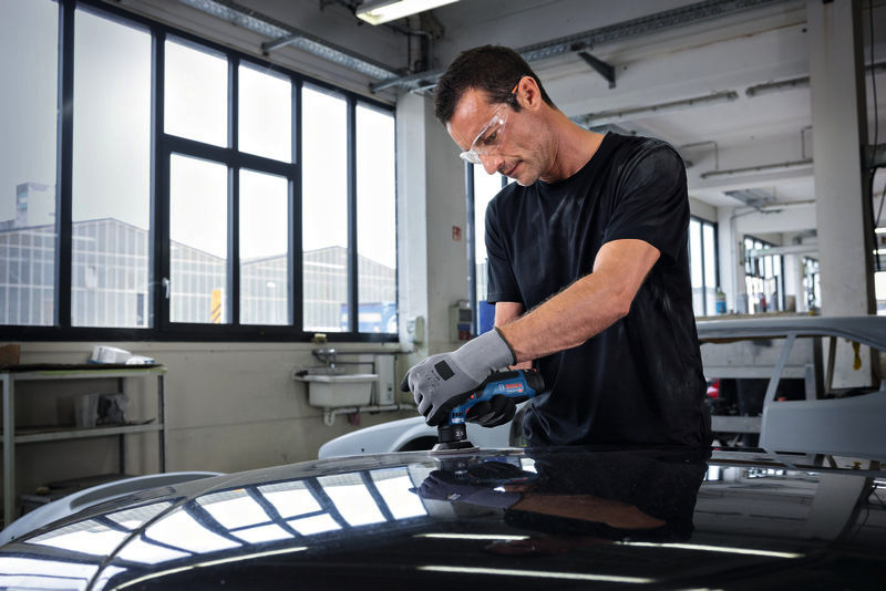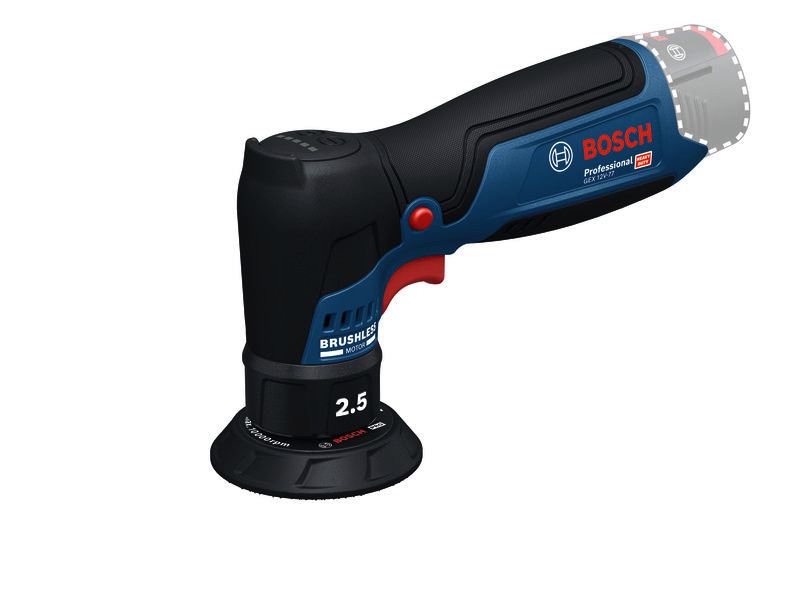 Exzenterschleifer GEX 12V-77, Der Akku-Schleifer GEX 12V-77 ist ein leistungsstarker Punktschleifer, auf den Sie sich verlassen können dank seines kraftvollen Bosch Professional 12V Systems und des bürstenlosen Motors. Die hervorragende Ergonomie dieses kompakten und komfortabel zu bedienenden Werkzeugs macht effizientes Feinstschleifen ermüdungsfrei und einfach. Über die komfortablen HMI-Funktionen können Sie die Drehzahlstufe mit dem Auslöseschalter für variable Drehzahl vorwählen und feineinstellen und außerdem den Akkustatus prüfen. Der GEX 12V-77 eignet sich zum Punktschleifen, Reparieren von lackierten Oberflächen, den Finish im Kfz-Bereich sowie zum Schleifen von Holz. Er kann zum Trocken- und Nassschleifen verwendet werden. Das Professional 12V System ist mit allen GBA 12V Akkus kompatibel. Der GEX 12V-77 verfügt über einen Schwingkreis von 2,5 mm für die Exzenterbewegung und einen Schleifteller von 77 mm. Karton