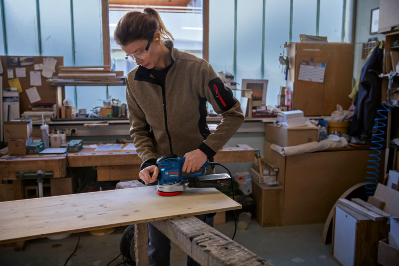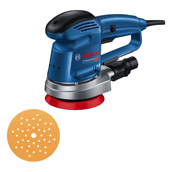 Exzenterschleifer GEX 34-125, Der GEX 34-125 Professional ist Boschs robuster, kabelgebundener 125-mm Exzenterschleifer mit hoher Abtragsleistung. Konstante Drehzahl und hohe Abtragsleistung garantieren selbst bei anspruchsvollen Oberflächen effiziente Ergebnisse. Ein Aluminiumlagerflansch gewährleistet lange Werkzeuglebensdauer und macht das Gerät zur idealen Lösung für schwierige Anwendungen. Dank seiner Ausstattung mit einem Multiloch-Schleifteller können Schleifblätter mit verschiedenen Lochrastern verwendet werden und die Staubabsaugung ist deutlich stärker. Dieser Exzenterschleifer wurde zum Schleifen, Zwischenschleifen, Feinschleifen und Lackentfernen konzipiert, er ist auf Holz, Furnier, Lack, Füllmasse sowie auf Mineral- und Acrylflächen einsetzbar. Er ist kompatibel mit dem Bosch Click & Clean System und einer Staubbox mit integriertem Bosch Microfilter System. Der GEX 34-125 Professional ist außerdem mit Drehzahlvorwahl und einem 125-mm-Schleifteller mit Klettsystem zur Schleifpapierbefestigung ausgestattet. Karton. 1 x Mehrlochschleifblatt C470, Best for Wood + Paint, 120 (separat erhältlich als 5er-Pack: 2 608 608 X75). Schleifteller (125 mm) (2 608 601 332). 1 x Papierstaubbeutel (separat als 3er-Pack erhältlich: 2 605 411 067). 1 x Absaugadapter (2 600 306 007)
