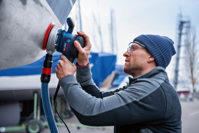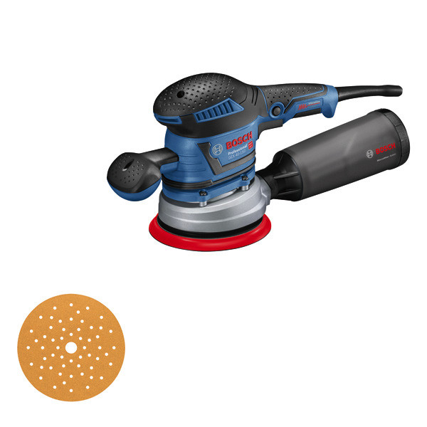 Exzenterschleifer GEX 40-150, Dies ist der kabelgebundene Exzenterschleifer aus der 150-mm-Kategorie von Bosch für starke Leistung und professionelle Schleifergebnisse. Sein Gehäuse mit entkoppelter Schleifeinheit sorgt für konstanten Anpressdruck und erstklassige Oberflächengüte. Seine einzigartige Vibrationsdämpfung gewährleistet sehr geringe Vibrationen und ermöglicht unterbrechungsfreies Arbeiten. Dieses Gerät ist mit einem Multiloch-Schleifteller für Schleifblätter mit verschiedenen Lochrastern und für eine deutlich stärkere Staubabsaugung ausgestattet. Dieser Exzenterschleifer eignet sich zum Schleifen, Zwischenschleifen, Lackentfernen, Feinschleifen und Polieren von Oberflächen. Er ist auf Holz, Furnier, Lack, Füllstoffen sowie Mineral- und Acrylflächen einsetzbar. Das Gerät ist mit dem Bosch Click & Clean System kompatibel. Dieses Gerät verfügt zudem über eine Staubbox mit integriertem Bosch Microfilter-System, einen 150-mm-Schleifteller mit Klettverschluss zur Schleifblattbefestigung, Drehzahlvorwahl und Vibration Control. Karton. Schleifteller (150 mm) (2 608 900 007). 1 x Mehrlochschleifblatt C470, Best for Wood + Paint, 120 (separat erhältlich als 5er-Pack: 2 608 608 X85). Microfilter Box (2 605 411 233). Zusatzhandgriff (2 602 026 177). Innensechskantschlüssel