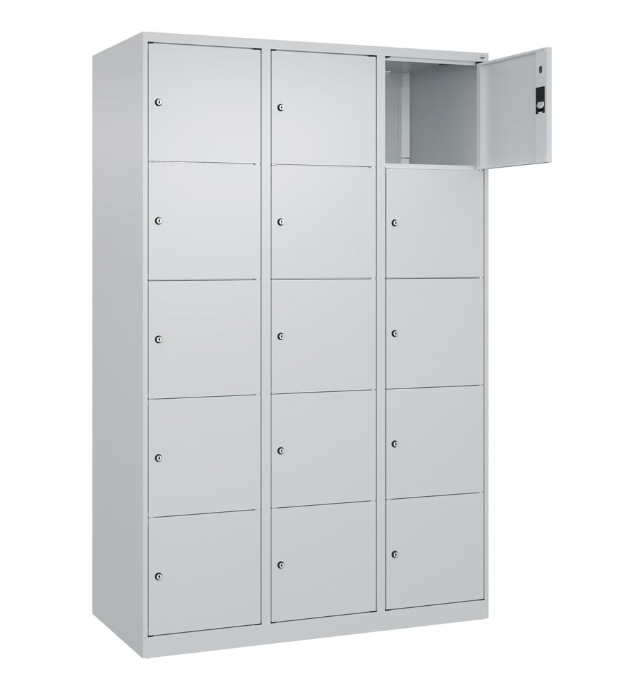 Fächerschrank, BxTxH 1200x500x1850 mm, 3x5 Fächer, Abt.B 400 mm, bodenstehend, Schloss, glatte Türen, RAL 7035