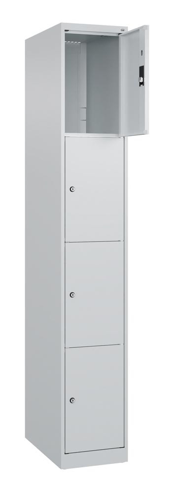 Fächerschrank, BxTxH 300x500x1850 mm, 1x4 Fächer, Abt.B 300 mm, bodenstehend, Schloss, glatte Türen, RAL 7035 E6479266