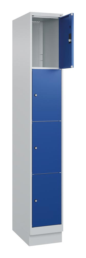 Fächerschrank, BxTxH 300x500x1950 mm, 1x4 Fächer, Abt.B 300 mm, Sockel, Schloss, glatte Türen, RAL 7035/5010 E6479309