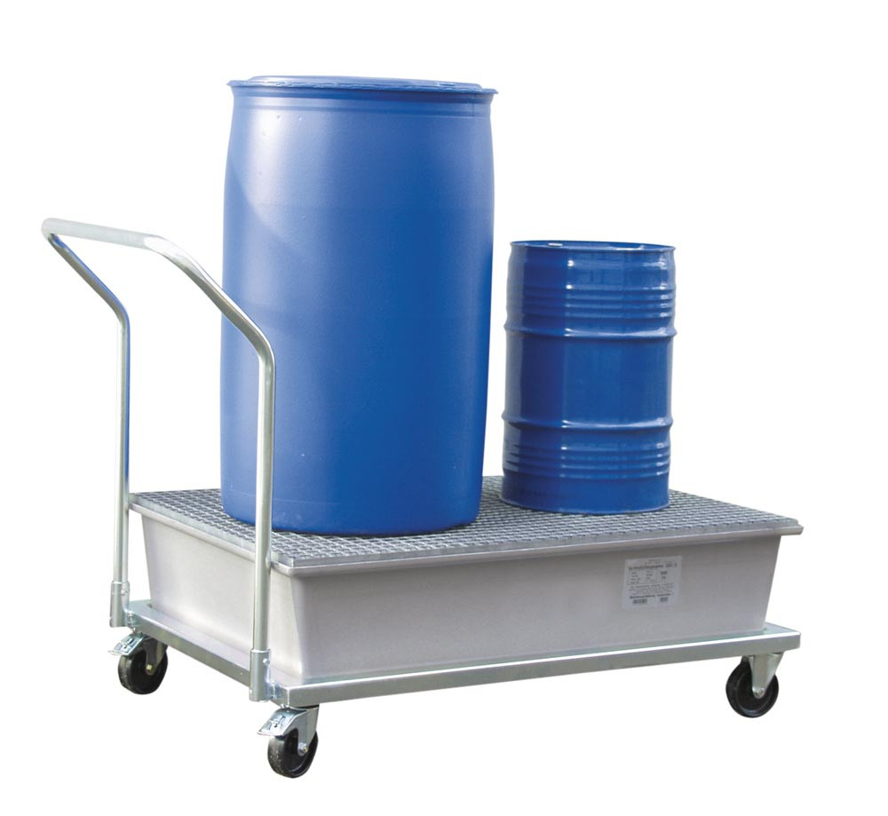 Fahrbare Auffangwanne aus GFK, Verz. Gitterrost, Fahrgestell mit Rammschutz, 2 Lenk- und 2 Bockrollen, Auffangvolumen 210 l, BxTxH 860x1090x1080 mm E813030