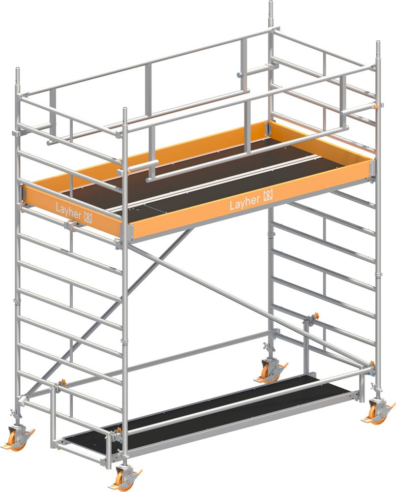 Fahrgerüst Breit P2 mit Sicherheits-Doppelgeländer, Arbeitshöhe 4,2m, Gerüsthöhe 3,43m, Standhöhe 2,2m, Gewicht ohne Balast: 187,3 kg