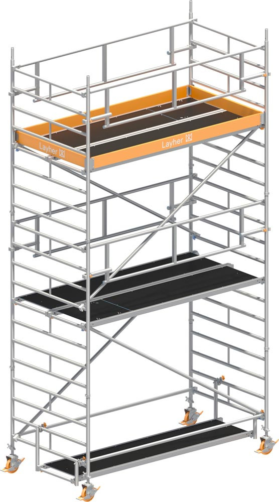 · "Universalgerüst" für höchste Höhen mit doppelt breitem Arbeitsboden ∙ Für Arbeiten mit sperrigem Material und dazu notwendiger Bewegungsfreiheit ∙ Standleitern (1,50 m breit) aus Aluminium für Steckmontage ∙ Doppelgeländer und Diagonalen aus Aluminium sind einfach einzurasten ∙ Arbeitsböden aus Aluminium-Rahmen und Sperrholz-Einlage als Durchstieg für gefahrlosen Innenaufstieg ∙ Robuste Lenkrollen mit zentrischer Lasteinleitung ∙ Stahlspindeln zum Niveauausgleich ∙ Zulässige Verkehrslast 2 kN / m2 (Lastklasse 3) ∙ Sicherheitsaufbau P2-Safetyplus - entspricht der Norm DIN EN 1004:2021