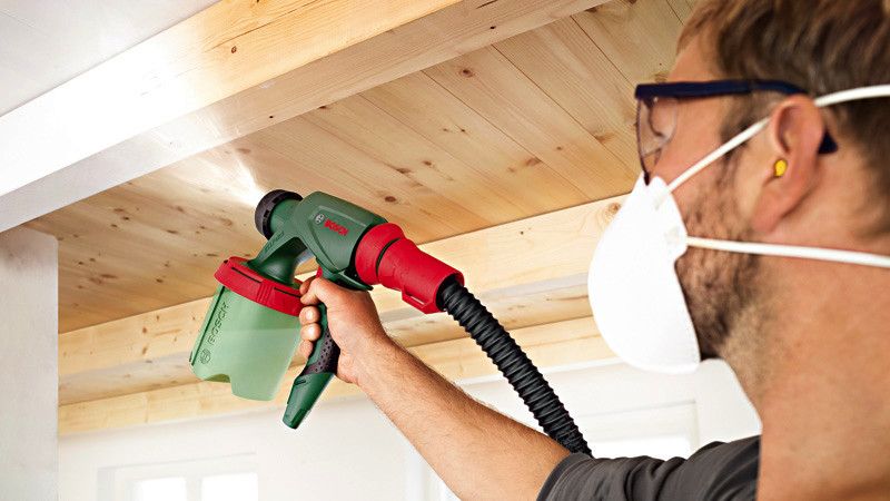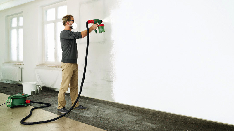 Farbsprühsystem PFS 7000. Ganz ohne Pinsel schneller und gleichmäßiger Auftrag auf strukturierten Oberflächen und Kanten. ALLPaint-Sprühsystem: zum Sprühen von Wandfarben, Lasuren oder Lacken. 1.400-W-Motor bietet den besten Farbauftrag seiner Klasse für blitzschnelle Ergebnisse. Schneller Farbauftrag mit 4 m²/min für große bis sehr große Projekte im Innen- und Außenbereich. Feine Farbzerstäubung für gleichmäßiges, tropffreies Auftragen auf alle Oberflächen. Zwei große 1.000-ml-Farbbehälter sparen wertvolle Zeit durch selteneres Nachfüllen während der Arbeit. Düse für Wandfarbe (weiß). Düse für Lacke (schwarz). Düse für Lasuren (grau). Farbfilter. Reinigungsbürste. 2 x 1000 ml Farbbehälter mit Deckel (1 600 A00 1GG). Karton