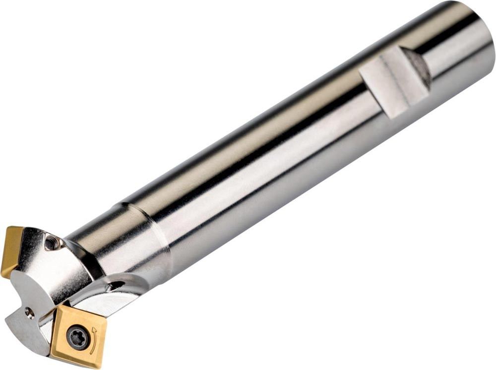 Entgratfräser mit doppelt negativer Geometrie zum spannen von 3 Stück SOMT 09T3.. einseitigen Wendeschneidplatten · Schnittdurchmesser 25 bis maximal 37.8mm mit 45° Anstellwinkel und 25mm Weldon Schaft gemäß DIN 1835B · 125mm Gesamtlänge · Kühlkanalbohrung zum Entgratfräsen mit einer maximalen Schnitttiefe von 4.5mm