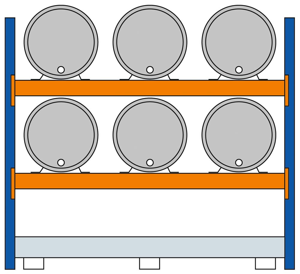 ∙ Rahmen aus Stahl, blau kunststoffbeschichtet ∙ Verstrebungen aus Stahl, verzinkt ∙ Holme aus Stahl, orange kunststoffbeschichtet ∙ Auffangwannen und Fassauflagen verzinkt ∙ Sonderausführungen wie z. B. Fass-Freilagerregale komplett mit Dach, sind auf Anfrage lieferbar ∙ Belastung pro Ebene bis 2300 kg (bei gleichmäßig verteilter Last)