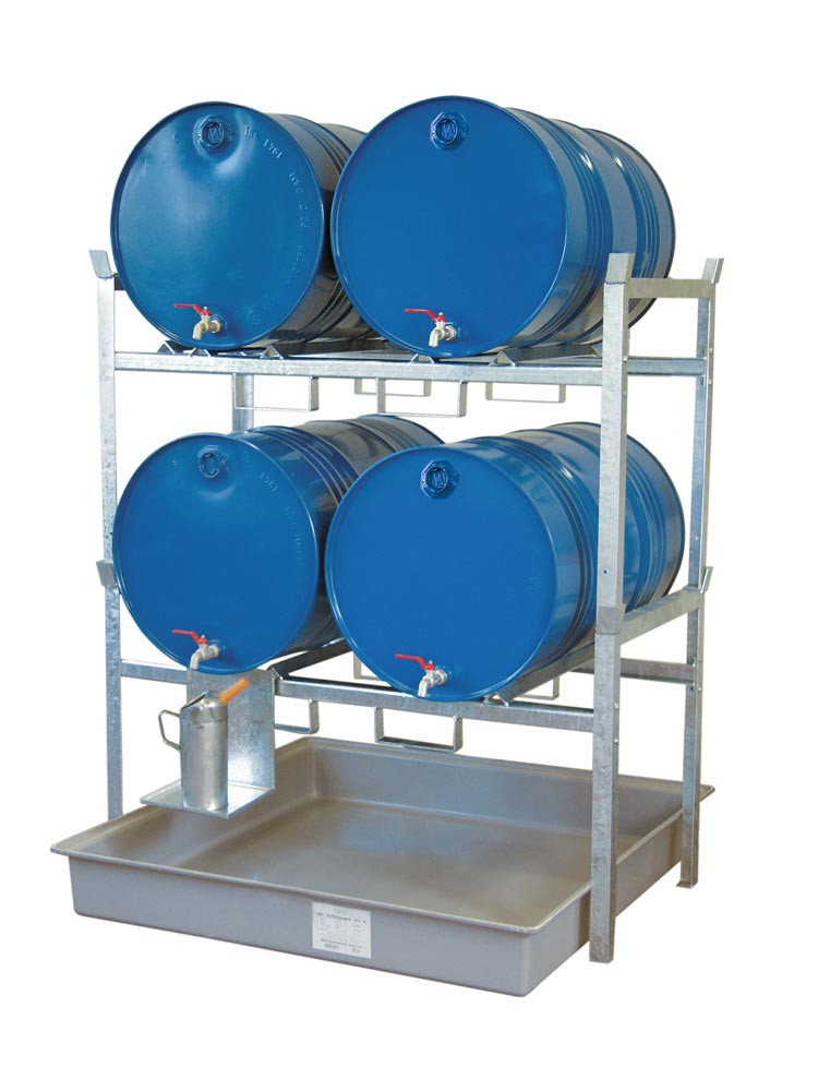 Fassregal, Stahl verzinkt, mit Fassauflage für 4x200-l-Fässer, GFK-Auffangwanne Auffangvolumen 220 l, BxTxH 1410x1280x1620 mm