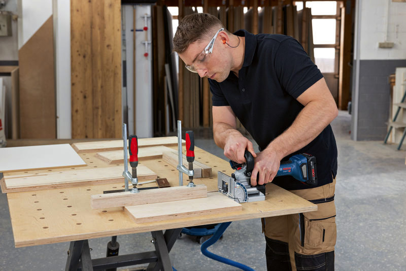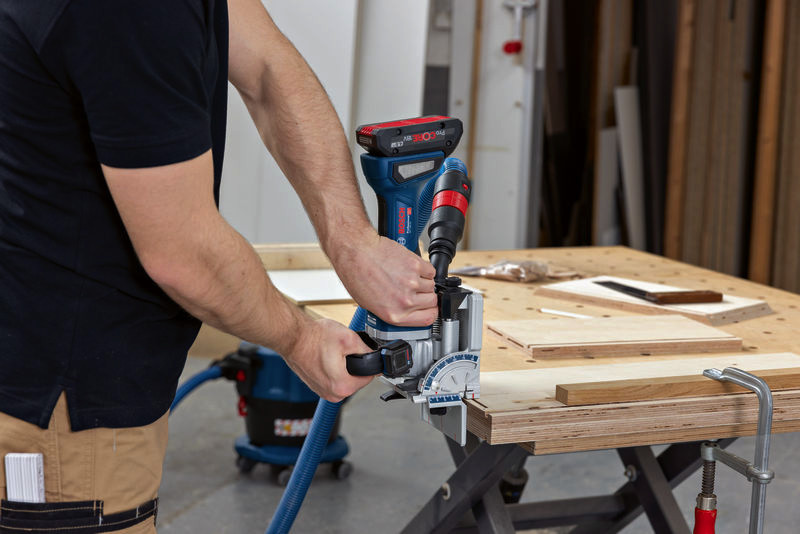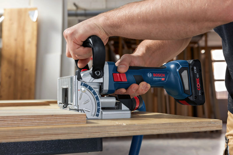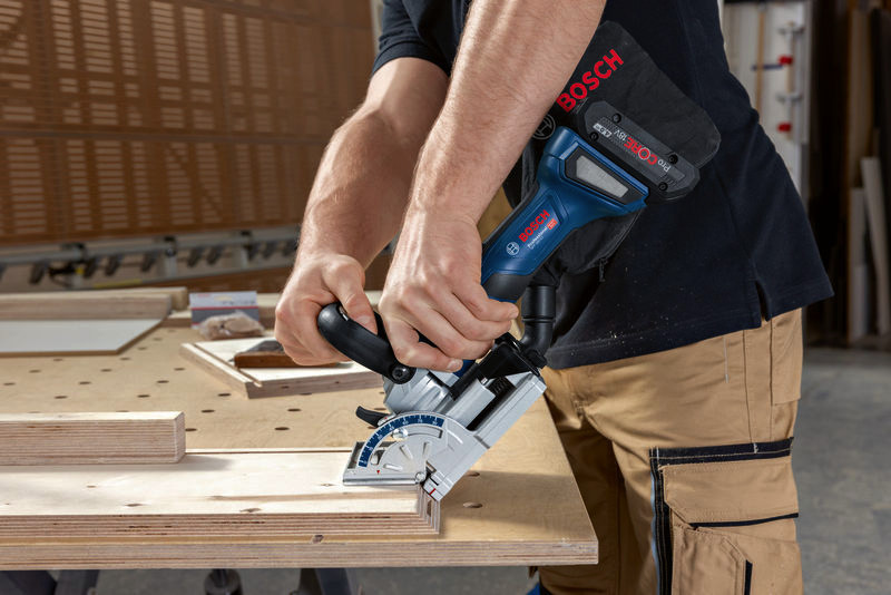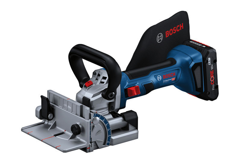 Flachdübelfräse GFF 18V-22, Bei Verwendung einer kabelgebundenen Flachdübelfräse zum Fräsen von Schlitzen ist die Mobilität eingeschränkt. Das ist unpraktisch. Unsere kabelfreie GFF 18V-22 Professional mit Staubsack bietet nicht nur maximale Freiheit, sondern auch ausgezeichnete Präzision. Das Werkzeug erlaubt uneingeschränktes Bewegen rund um die Werkbank beim Verbinden von Holzwerkstücken. Dank der leichtgängigen Tauchfunktion, robusten Aluminium-Winkelanschlägen und zahlreichen Funktionen und Einstellmöglichkeiten kannst du auf hervorragende, professionelle Arbeitsergebnisse und hohen Komfort zählen. Frästiefe, -höhe und -winkel lassen sich einstellen, ohne dass ein zusätzliches Werkzeug hierfür erforderlich ist. Es gibt deutliche Markierungen für die Anzeige der waagerechten und senkrechten Schnittposition. Für Anwenderschutz und mehr Sauberkeit im Arbeitsbereich ist ein Absaugstutzen integriert, der für staubfreies Fräsen an den Staubsack oder einen Staubsauger angeschlossen werden kann innerhalb des Bosch-Systems ist kein Adapter erforderlich. Top Ergebnisse bei Tauchschnitten für halbmondförmige Schlitze in Holzwerkstücken, um Flachdübel zu platzieren. Mit diesem Werkzeug lassen sich zahlreiche Verbindungsarten erzeugen, einschließlich Eck-, Gehrungs-, Schräg-, Längs-, Quer-, Rahmen- und Mittelwandverbindungen in Holzwerkstücken aus Spanplatte, Hartholz, Weichholz, Sperrholz und Holzfaserplatte. Dieses Werkzeug funktioniert mit allen Scheibenfräsern mit einem Durchmesser bis zu 105 mm. Kompatibel mit dem Bosch Professional 18V System und mit der markenübergreifenden AMPShare Akku-Allianz. Bürstenlose Technologie sorgt für mehr Effizienz und eine längere Lebensdauer der professionellen Flachdübelfräse. Dieses Werkzeug ist mit Wiederanlaufschutz, Überlastschutz und Sanftanlauf ausgestattet. Kartonschachtel mit Kartoneinsatz. Scheibenfräser, 105 x 22 mm, 8 (3 608 641 013). Staubbeutel (1 600 A02 UW6). Aufsteckplatte (1 600 A02 LR1). Zweilochmutterndreher (1 607 950 052)