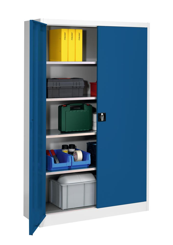 Flügeltürenschrank, 4 verz. Fachböden, BxTxH 1200x420x1950 mm, RAL7035 lichtgrau/RAL5010 enzianblau