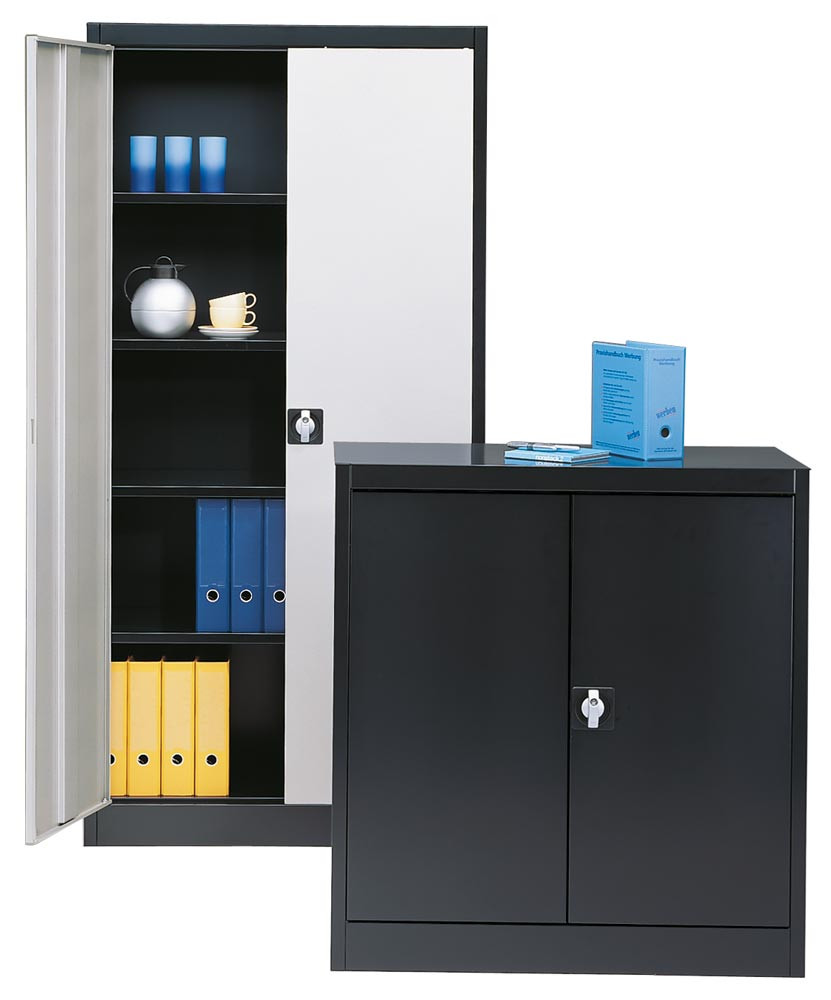 ∙ Stabil verschweißte Stahlkonstruktion mit verwindungsfesten Türen mit Kastenversteifung · Flügeltüren mit Dreiriegelverschluss und Drehzylinder-Sicherheitsschloss, verschiedenschließend ∙ Türöffnungswinkel ca. 135° · Schwarz lackierte Fachböden, verstellbar im 35 mm Raster · Tragkraft pro Fachboden 65 kg (bei gleichmäßig verteilter Last)