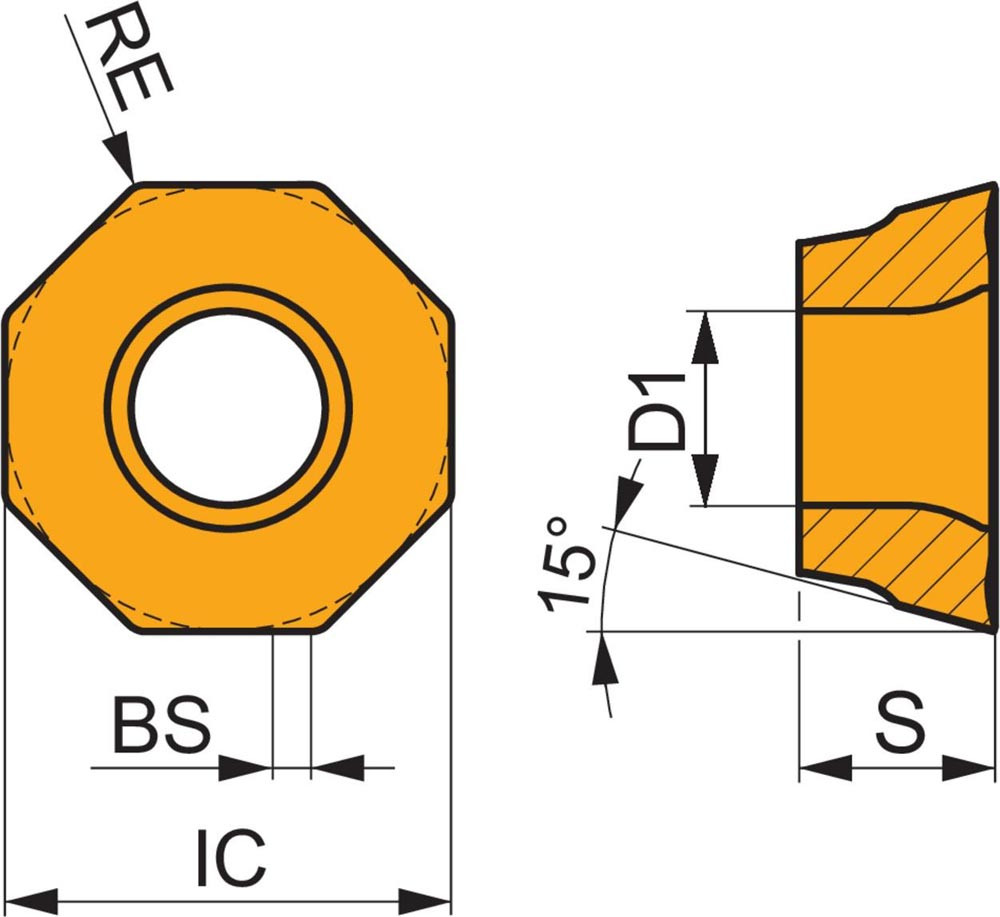 Einseitige Fräswendeschneidplatte ODKT 0505 mit Spanbrecher · Oktagonal für eine maximale Schnitttiefe von 2.7mm · mit 0.8mm Eckenradius · eine Indexierungsgenauigkeit gemäß ISO-Toleranzklasse-K und FM Geometrie mit verrundeter und facettierter Schneidkante · M6330 PVD Beschichtung WC-Co Substrat in den ISO-Gruppen P20 -P35 und M20 -M35 zum bearbeiten von Stahl und nichtrostenden Stahl mit Kopierplanfräsern SOD05