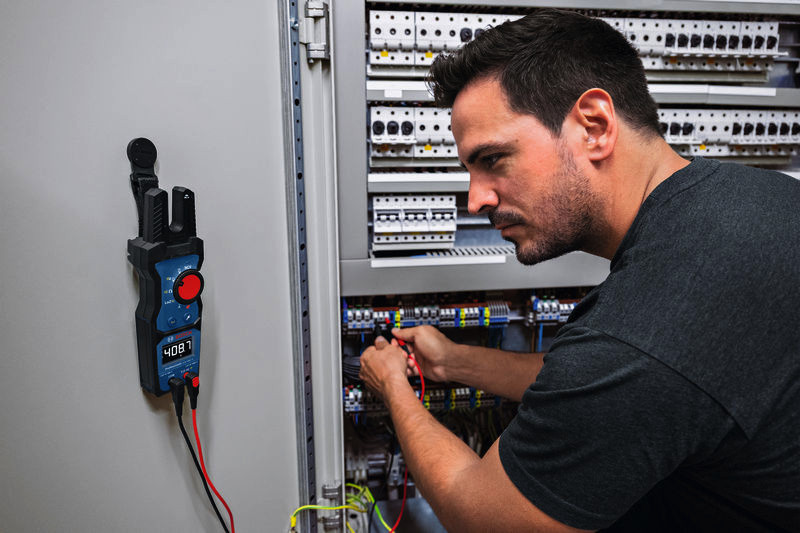 Gabelstromzange GFM 1000-15 + MH 1, Die Gabelstromzange GFM 1000-15 Professional wurde für Profis entwickelt, die Wechselströme sowie Wechsel-/Gleichspannungen schnell und effizient prüfen müssen. Die Ausführung mit offener Zange ermöglicht Wechselstrommessungen bis 200 A ohne Messleitungen, was Zeit und Mühe spart. Dieses All in One-Gerät misst Wechselstrom, Wechsel-/Gleichspannungen bis 1000 V, Durchgang, Widerstand und verfügt über eine integrierte Funktion LoZ V AC/DC. Durch die robuste Bauweise mit Schutzklasse IP54 hält sie Stürzen aus bis zu 2 m Höhe und rauen Bedingungen stand. Ein bequemer Griff verringert Ermüdung bei längerem Gebrauch und macht sie damit zu einem Muss für Elektriker und HLK-Techniker. Die GFM 1000-15 Professional ist ideal für Elektriker und HLK-Techniker und bietet eine nichtinvasive Wechselstrommessung für schnelleres Arbeiten, ohne Stromkreise zu unterbrechen. Das kompakte Design erleichtert den Einsatz an engen Stellen, z. B. an beengten Schalttafeln und anderen schwierigen Umgebungen. Der integrierte berührungslose Spannungsprüfer (NCV) und die Taschenlampe erhöhen Sicherheit und Komfort und machen sie zu einer zuverlässigen Wahl für Elektroinstallationen, Wartungen und Reparaturen. Die GFM 1000-15 Professional ist mit einem Li-Ion-Akkupack für lang anhaltende Leistung kompatibel, sie verfügt über ein LCD-Display mit invertierter Anzeige, True RMS für genaue Messwerte und eine Hold-Funktion zur einfachen Erfassung von Messwerten. Kompatibilität mit der vielseitigen Magnetaufhängung MH 1 Professional erleichtert die Anwendung, während CAT IV 600 V und CAT III 1000 V für hervorragenden Anwenderschutz sorgen. Hochwertige Messleitungen aus flexiblem, langlebigem Silikon sorgen für verlässliche Haltbarkeit, die praktische Aufbewahrung der Messspitzen und ein kompaktes Design erleichtern den Transport und den Einsatz an jedem Arbeitsort. Tasche. 2 x 1,5 V LR6-Batterie (AA). MS 90 Professional (1 600 A03 8D2). MH 1 Professional (1 600 A03 8CY)