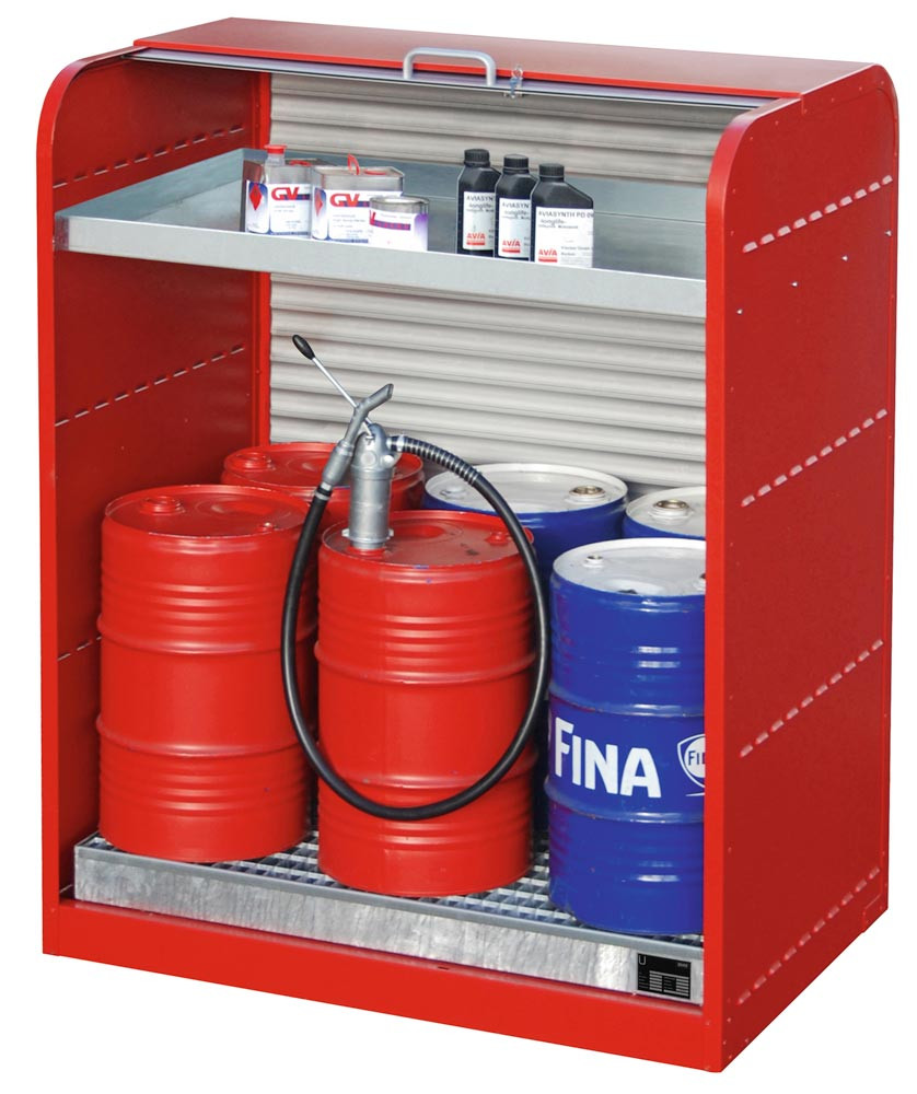 Gefahrstoff-Depot für 6x60-l-Fässer, BxTxH 1300x870x1610 mm, 2 Wannen, 1 mit Gitterrost, Vol. 73 l + 45 l, Rolllade, RAL 3000