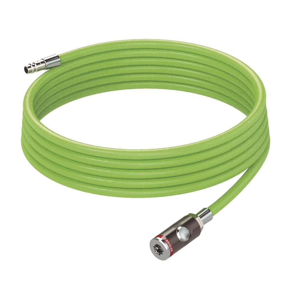 flexibler, druckbeständiger und abriebfester Standardschlauch · Sicherheitskupplung · hohe Sicherheit durch Signalfarbe – leuchtgrün · konfektioniert mit Druckknopf-Sicherheitskupplung NW 7,4 und Einstecktülle Stahl verzinkt