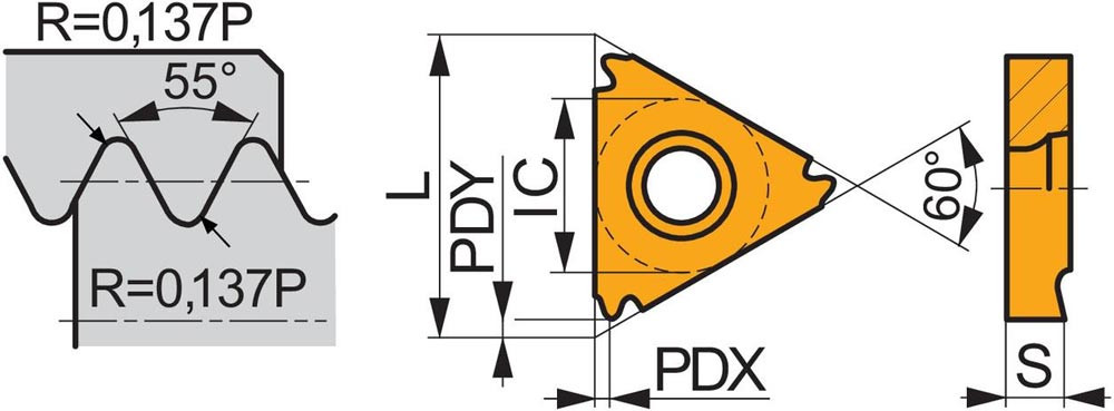 Einseitige gepresste Gewindedreh-Wendeschneidplatte · dreieckig mit einem Innenkreisdurchmesser von 6.35mm · für rechtsschneidende Werkzeuge für BSW-Innengewinde mit 14TPI · T8030 PVD beschichtet feinkörniges WC-Co-Hartmetall innerhalb der ISO-Substrats-Bereiche P25-P40/M20-M35 und K20-K40 zum zerspanen von Stahl · Edelstahl und Guss