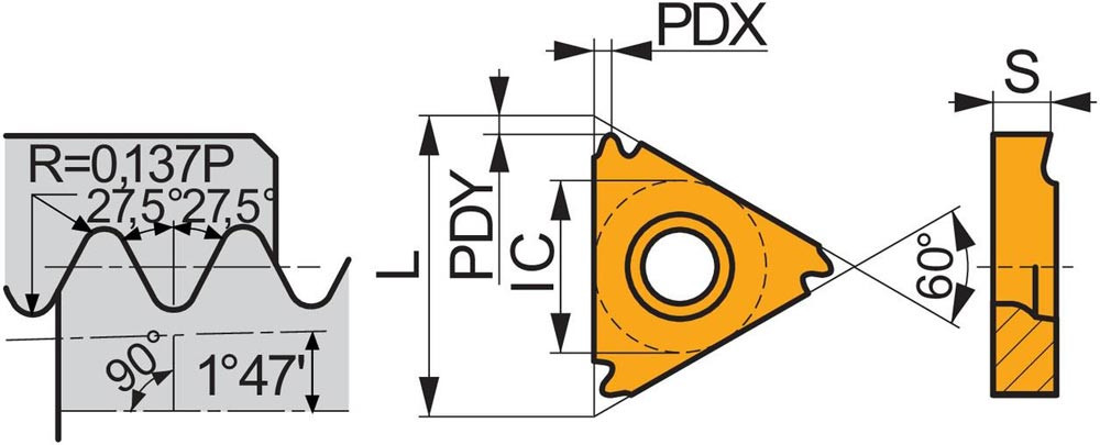 Einseitige Gewindedreh-Wendeschneidplatte · dreieckig mit einem Innenkreisdurchmesser von 9.525mm · für rechtsschneidende Werkzeuge für BSPT-Außengewinde mit 14TPI · T8030 PVD beschichtet feinkörniges WC-Co-Hartmetall innerhalb der ISO-Substrats-Bereiche P25-P40/M20-M35 und K20-K40 zum zerspanen von Stahl · Edelstahl und Guss
