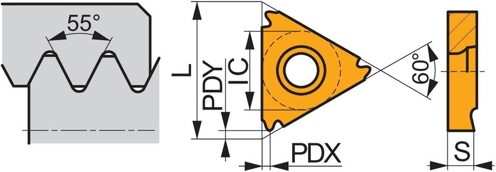 Einseitige Gewindedreh-Wendeschneidplatte · dreieckig mit einem Innenkreisdurchmesser von 9.525mm · für rechtsschneidende Werkzeuge Teilprofil für British Standard Innengewinde mit 14 bis 8TPI · T8030 PVD beschichtet feinkörniges WC-Co-Hartmetall innerhalb der ISO-Substrats-Bereiche P25-P40/M20-M35 und K20-K40 zum zerspanen von Stahl · Edelstahl und Guss