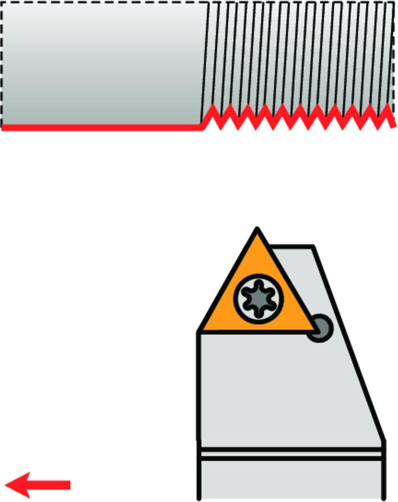 Schraubgeklemmte Gewindedrehhalter mit 1.5° Helixwinkel zum spannen einer dreieckigen Wendeschneidplatte mit einem Innenkreisdurchmesser von 12.7mm (Bezeichnung TN 22EN.. ) · rechte Sonderausführung mit Zylinderschaft · 25mm Werkzeughöhe 25mm Breite und 150mm Gesamtlänge zum Außengewinden