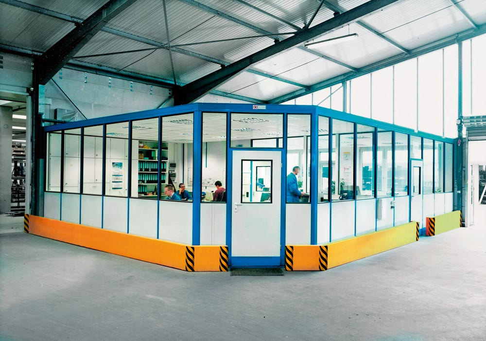 Hallenbüro, 3-seit. an Gebäudewand, ohne Boden, 2 Leuchten, BxTxH 3045x3050x2630 mm, RAL 9002 grauweiß, Rahmen RAL 5010 enzianblau E861935