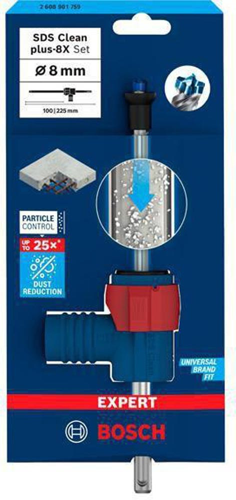 Bohren in Stahlbeton mit verbesserter Staubreduzierung! Durchdringt Stahlbeton mit einem Voll-Carbide-Kopf mit 4 Schneidern Installateure und Bauarbeiter wissen nur zu gut · dass beim Bohren in Beton große Mengen an Staub anfallen. Besonders unangenehm ist dies beim Bohren über Kopf oder beim Bohren und Reinigen für chemische oder mechanische Dübel. Für diese anspruchsvollen Arbeiten haben wir das EXPERT SDS Clean plus-8X Set entwickelt. Mit diesem Set bohrst und entfernst du gleichzeitig Staub und Bohrmehl · sodass mühsame Reinigungsarbeiten entfallen. Mit EXPERT SDS Clean plus-8X Set wird der Staub beseitigt · wenn du über Kopf oder eine ganze Reihe von Löchern für mechanische oder chemische Dübel bohren musst. Der Bohrer ist mit einem Vollhartmetallkopf mit 4 Schneiden und innenliegendem Absaugkanal ausgestattet. Zudem haben wir den SDS Clean plus Anschluss verbaut · der für alle SDS Clean plus-8X Bohrer geeignet ist und sich leicht montieren und abnehmen lässt. Er verbindet die Bohrmaschine mit Staubabsaugungen · sodass Staub und kleines Bohrgut durch den integrierten Absaugkanal aus dem Bohrloch extrahiert werden kann. Die vormontierte Staubkappe unterstützt das Auffangen von Schmutz und Staub · sobald du mit dem Bohren beginnst. Hocheffizienter Abtransport von Staub mit Bosch Particle Control