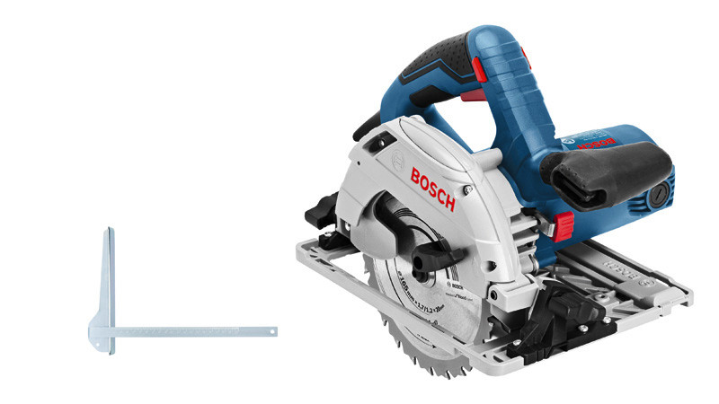Handkreissäge GKS 55+ GCE, Dieses Gerät erreicht eine hohe Schnittkapazität, sogar dort, wo dies normalerweise nur mit wesentlich größeren Sägeblättern möglich ist. Bei zahlreichen Materialien erreicht die Kreissäge dank ihres zweistufigen Getriebes eine Schnitttiefe von 63 mm. Sie läuft außerdem reibungslos auf dem Bosch Führungsschienensystem und lässt sich für genaues Sägen optimal führen. Die elektronische Drehzahlregelung ermöglicht eine variable Drehzahl für die Arbeit mit verschiedensten Materialien. Genaue Ergebnisse beim Sägen in verschiedenen Holzmaterialien, z. B. in Holzwerkstoffen wie OSB, Sperrholz oder MDF. Die Säge ist mit dem Bosch Führungsschienensystem kompatibel, ebenso mit den Schienensystemen von Mafell, Festool und Makita. Dieses Gerät verfügt über Gebläse, Absaugstutzen, Fußplatte aus Aluminiumdruckguss, konstante Drehzahl, schnelle Motorbremse, Sanftanlauf und Spindelarretierung. Innensechskant. Karton. 1 x Kreissägeblatt, Standard for Wood speed, 165 x 1,7 x 20 mm, 12 (2 608 642 600). Parallelanschlag (1 608 190 007). Vakuumadapter