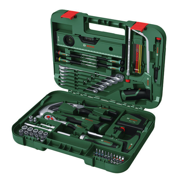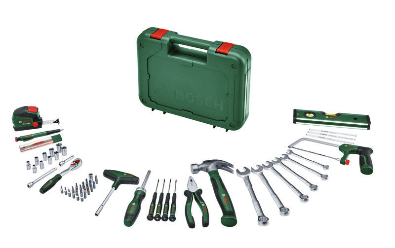 Handwerkzeuge Advanced Werkzeugkoffer 64-teilig. Das hochwertige, vielseitige Set für fortgeschrittene Heimwerkerprojekte. Dieses Set umfasst alles, was du brauchst, um Reparaturen im Haus sowie anspruchsvollere Aufgaben effizient auszuführen. 64-teiliges gemischtes Set mit einer Bügelsäge, Schraubendrehern, einem Klauenhammer, Zangen und mehr. Langlebige Produkte aus hochwertigen Materialien. Komfortable, kontrollierte Werkzeughandhabung dank ergonomischer Eigenschaften. Robuster Handwerkerkoffer für mühelosen Transport und praktische Lagerung. 1 x Kombinationszange 180 mm. 1 x 1/4"-Ratsche. 1 x Bit-Ratschenschraubendreher. 1 x Bit-Schraubendreher T-Griff. 4 x Präzisionsschraubendreher (PH00, PH0, SL1.5, TX6). 1 x Klauenhammer 340 g / 12 oz. 1 x tape measure 5m/16 (1 600 A02 Z9Y). 1 x Stiftclip. 1 x spirit level 25cm (1 600 A03 2V5). 1 x Bügelsäge 150 mm. 1 x Tieflochmarker Bleistift. 6 x Ringmaulschlüssel (10,12, 13,15, 17,19 mm). 4 x Bügelsägeblatt 24 TPI. 6 x mehrfarbige Minen (rot, gelb, Graphit). 20 x Bit 25 mm (PH1/2/3, PZ1/2/3, SL3/4/5/6, TX10/15/20/25/30/40, HEX3/4/5/6). 10 x Steckschlüssel mit 1/4"-Antrieb (5, 5,5, 6, 7, 8, 9, 10, 11, 12, 13 mm). 2 x Verlängerung mit 1/2"-Antrieb (75, 250 mm). 2 x Adapter (Sechskant und 1/4"). Koffer