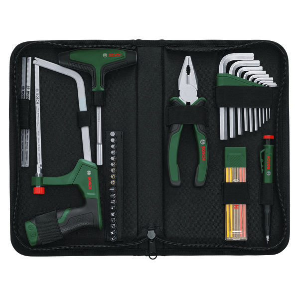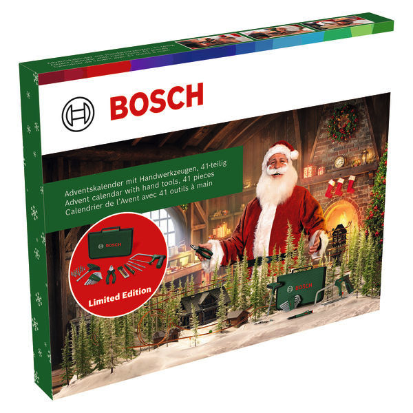 Handwerkzeuge Adventskalender 2025. Ein festlicher Adventskalender mit einem praktischen und vielseitigen 41-teiligen Werkzeugset für Heimwerker. Zähle die Tage bis Weihnachten herunter: mit dem Bosch Handwerkzeug-Adventskalender für Heimwerker! Jeden Tag kommt ein hochwertiges Handwerkzeug oder Zubehör zum Vorschein perfekt zum Basteln, Reparieren und Kreieren über das ganze Jahr hinweg. Hochwertige, langlebige Werkzeuge mit ergonomischem Design für hohen Komfort. Es enthält eine 150mm-Bügelsäge, einen Bit-Schraubendreher mit T-Griff, eine 180mmKombizange, einen Tieflochmarker, ein 10-teiligen Innensechskantschlüssel-Set, 18 farbcodierte Schraubendreherbits, 2 Bügelsägeblätter und 6 mehrfarbige Minen. Inklusive einer praktischen Aufbewahrungstasche aus Stoff. 1 x Bügelsäge 150 mm (1 600 A02 7A7). 1 x Kombinationszange 180 mm (1 600 A03 2VB). 1 x Bit-Schraubendreher mit T-Griff (1 600 A02 Z9U). 1 x Tieflochmarker Bleistift (1 600 A03 2V2). 10 x Sechskantschlüssel (1,5. 2. 2,5. 3. 4. 5. 5,5. 6. 8. 10 mm). 2 x Bügelsägeblätter 150 mm 24 TPI (1 600 A03 2UL). 18 x Bit (PH1/2/3, PZ1/2/3, SL4/5/6, TX10/15/20/25/30, HEX3/4/5/6). 6 x Mine, mehrfarbig (1 600 A03 2UV). 1 x Stofftasche mit Reißverschluss