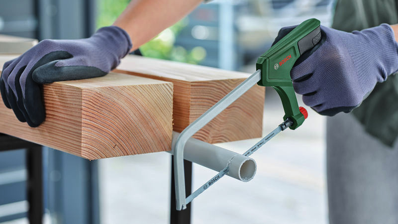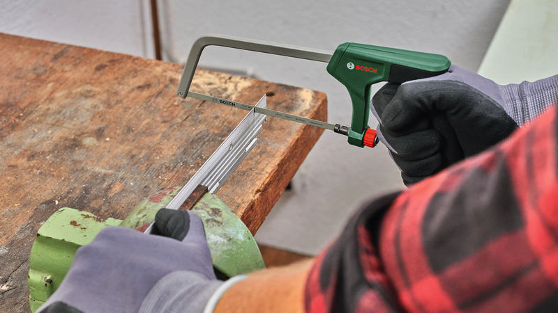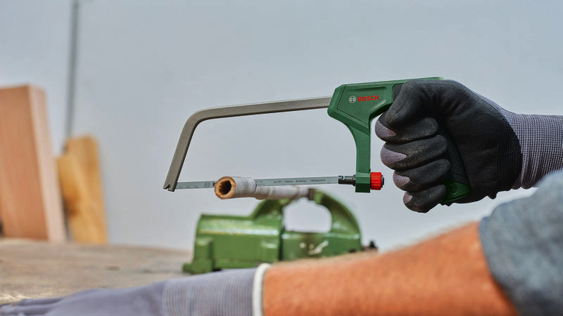 Handwerkzeuge Bügelsäge 150 mm. Die kompakte 150-mm-Bügelsäge für Metall, Kunststoff und Weichholz. Hervorragendes ergonomisches Design mit Softgrip sorgt für optimale Kraft und Kontrolle. Feines 150-mm-Bimetall-Sägeblatt mit 24 TPI für präzise und saubere Schnitte. Lang anhaltende Leistung dank harter Sägezähne mit 6268 HRC. Intuitiver Entriegelungsmechanismus für einfachen Sägeblattwechsel. Ideal für kleine Schneidarbeiten, insbesondere in weichem Metall, aber auch in Kunststoff und weichem Holz