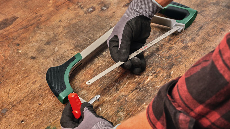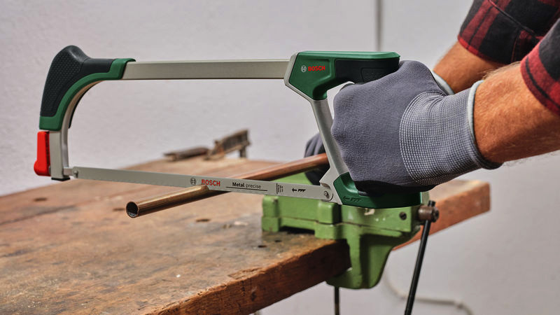 Handwerkzeuge Bügelsäge 300 mm. Die Allrounder-Bügelsäge 300 mm für saubere Schnitte in Metall, Holz und Kunststoff. Robustes Gehäuse mit ergonomischem Design inklusive Softgrip und zweitem Handgriff für optimale Kontrolle, Kraft und Komfort. Feines 300-mm-Bimetall-Sägeblatt mit 24 TPI für präzise Schnitte in Metall, Kunststoff und mehr. Lang anhaltende Leistung dank harter Sägezähne mit 6268 HRC. Intuitiver Entriegelungsmechanismus für einfachen Sägeblattwechsel. Vielseitiges normales und bündiges Schneiden mit 45°- und 90°-Schnittwinkeln