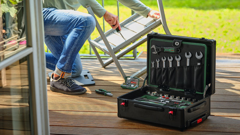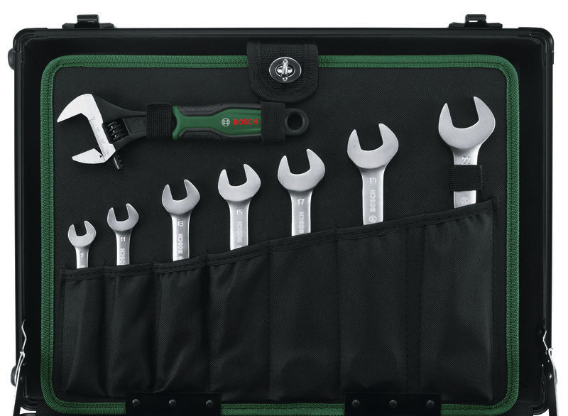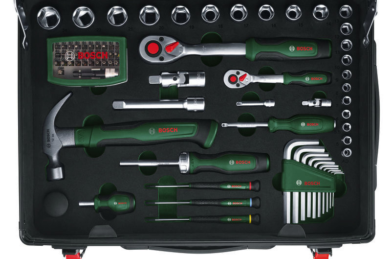 Handwerkzeuge Rollwerkzeugkoffer-Set 119-teilig. Hochwertiger All-in-One-Werkzeugsatz im in einem Rollkoffer. 119-teiliges Set mit Zange, Bit-Schraubendrehern, Cutter-Messer, Hammer, Bügelsäge und mehr. Hochwertige Materialien sorgen für Langlebigkeit. Optimale Ergonomie für mehr Kontrolle und Komfort. Rollkoffer mit Teleskopgriff für einfaches Transportieren und Aufbewahren. Cleveres Aufbewahrungssystem sorgt für gut geordnete Handwerkzeuge. Inklusive Knieschoner für komfortableres Arbeiten. 1 x Kombinationszange 180 mm (1 600 A03 2VB). 1 x long nose pliers 180 mm (1 600 A03 2VC). 1 x Seitenschneider 160 mm (1 600 A03 2VE). 1 x Kneifzange 200 mm (1 600 A02 Z9W). 1 x Wasserpumpenzange 180 mm (1 600 A03 9HU). 1 x Maßband 3 m (1 600 A03 2UX). 1 x Wasserwaage 25cm mit Markierschiebern (1 600 A02 7PL). 1 x Klauenhammer 340 g / 12 oz (1 600 A02 W7X). 1 x weicher Stoßfänger. 1 x Bügelsäge 150 mm (1 600 A02 7A7). 1 x Halbrundfeile aus Metall 200 mm / 8" (1 600 A03 DR8). 1 x Bit-Ratschenschraubendreher (1 600 A02 Z99). 1 x kurzer Bit-Schraubendreher PH1 (1 600 A03 EC2). 3 x Präzisionsschraubendreher (SL2.5, PH0, TX8). 1 x Rollgabelschlüssel 150 mm / 6" (1 600 A03 9HN). 1 x Cutter Messer 18 mm inkl. 3 Klingen (1 600 A03 2V8). 10 x snap-off blade SK5 steel (1 600 A03 2US). 1 x Tieflochmarker Bleistift (1 600 A03 2V2). 6 x Mine, mehrfarbig (1 600 A03 2UV). 10 x Sechskantschlüssel (1,5. 2. 2,5. 3. 4. 5. 5,5. 6. 8. 10 mm). 7 x Doppelmaulschlüssel (8/9, 10/11, 12/13, 14/15, 16/17, 18/19, 20/22). 1 x 1/2" Ratsche (1 600 A03 17V). 10 x Steckschlüssel mit 1/2"-Antrieb (14, 15, 16, 17, 18, 19, 20, 21, 22, 24 mm). 1 x 1/2 drive universal joint adapter. 1 x Verlängerung mit 1/2"-Antrieb 125 mm. 1 x 1/4"-Ratsche. 10 x Steckschlüssel mit 1/4"-Antrieb (5, 5,5, 6, 7, 8, 9, 10, 11, 12, 13 mm). 1 x Verlängerung mit 1/4"-Antrieb 50 mm. 1 x Kreuzgelenkadapter mit 1/4"-Antrieb. 32 x Bit 25 mm. 1 x Spinnerhandgriff. 1 x Werkzeugkoffer mit Rollen
