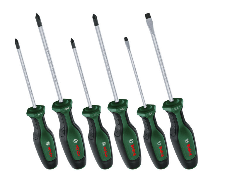 Handwerkzeuge Schraubendreher-Set, 6-teilig. Ausgezeichnete Qualität, höchster Komfort: Hochleistungs-Schraubendreher für verschiedenste Heimwerkeraufgaben. Erstklassiger Schaft aus hartem S2-Stahl für ein solides Drehmoment. Ergonomischer Griff mit Softgrip für optimale Kontrolle und Komfort. Magnetische Spitze für besseren Halt beim Schrauben. Schnelle Wahl durch Farbcodierung für Größe und Form am Handgriff. Stabil, wegrollsicher dank sechseckiger Form. 1 x Schraubendreher PH1 x 100 mm. 1 x Schraubendreher PH2 x 125 mm. 1 x Schraubendreher PZ1 x 100 mm. 1 x Schraubendreher PZ2 x 125 mm. 1 x Schraubendreher SL4 x 100 mm. 1 x Schraubendreher SL6 x 125 mm