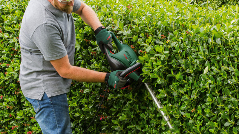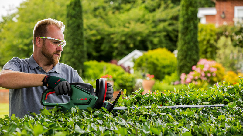 Heckenschere UniversalHedgeCut 60. Geballte Leistungskraft für mittelgroße Hecken bei 80 % niedrigerem Geräuschpegel. ProSilence ermöglicht eine kraftvolle Leistung mit 80 % Geräuschdämpfung auf 91 dB(A). Messerlänge von 60 cm und 30 mm Zahnabstand für intensive Trimmarbeiten. Rutschkupplung mit hohem Drehmoment ermöglicht kraftvolle Schnitte durch dicke Äste. Effizienter 480-Watt-Motor und hohe Schneidkraft für beeindruckende Leistungen. Perfekt zum Trimmen mittelgroßer Hecken. Messerabdeckung. Kartonschachtel