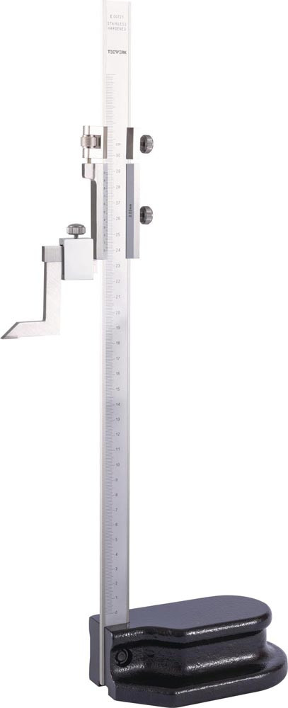 massiver Standfuß · massive, kräftige Säule · mit Feineinstellung · Ableseteile blendfrei verchromt · mm-Ablesung · Ablesung 0,02 mm · Anreißnadel HM-bestückt
