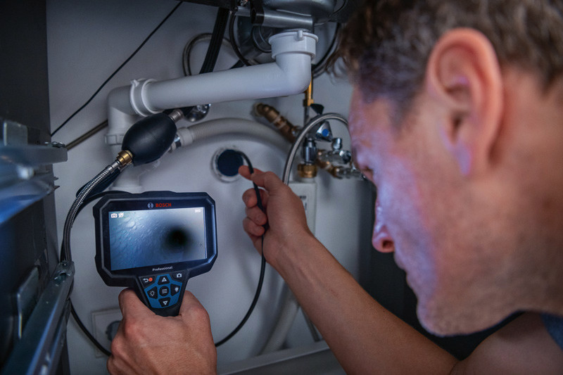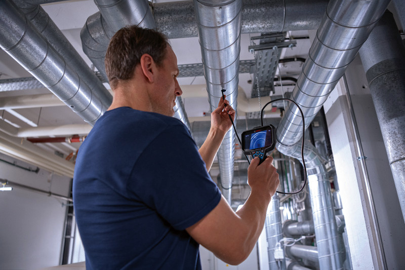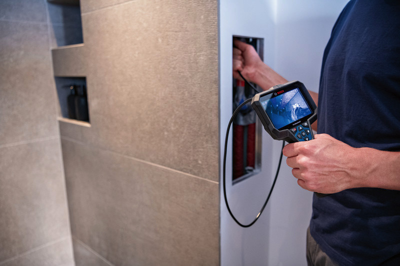 Inspektionskamera GIC 12V-5-27 C, Die Inspektionskamera GIC 12V-5-27 C Professional bringt neuen Komfort für Klimatechniker/Installateure, Automechaniker oder Elektriker. Dieses ergonomische Gerät verfügt über ein großes 5"-Display mit einer sehr hohen Auflösung von 1280 x 720 Pixeln für einen detaillierten Blick bei der Inspektion von Rohren, Kanälen oder anderen schwer zugänglichen Stellen. Egal in welche Richtung der Kamerakopf zeigt, während der Verwendung muss der Benutzer sich keine Gedanken über die Bildausrichtung machen, denn eine einzigartige AutoUp-Funktion sorgt für eine automatische Bildrotation. Diese robuste Kamera hält Staub und Wasser auf rauen Baustellen stand. Der Kamerakopf erfüllt die Schutzklasse IP67 und ist damit vor Staub und kurzes Untertauchen in Wasser geschützt. das gesamte Gerät ist gemäß IP54 staub- und spritzwassergeschützt. Die Inspektionskamera eignet sich perfekt für zahlreiche handwerkliche Anwendungen wie Inspektionen des Inneren von Verteilerkästen, Rohren und Wandhohlräumen sowie für Hydrauliksysteme und Anwendungen im Automobilbereich. Fotos und Videoaufnahmen lassen sich bei der GIC 12V-5-27 C Professional leicht über USB-C®-Kabel oder Micro-SD-Karte übertragen. Kamerakabel für GIC, Ø 8,3 mm, Länge 1,5 m (1 600 A02 R6M). Haken, Magnet, Spiegel. Akku-Adapter (1600A017HF/1600A017HH). 4 x 1,5 V-LR6-Batterie (AA). USB-C®-Kabel. Micro-SD-Karte, 32 GB