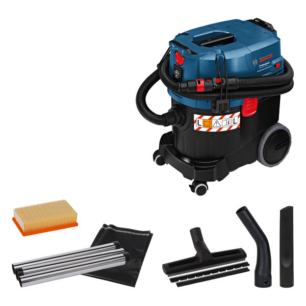 Kabelgebundener Sauger GAS 35 L SFC+, Der GAS 35 L SFC+ Professional ist Boschs Nass- und Trockensauger der Staubklasse L mit praktischem semi-automatischen Filterreingigungssystem (SFC+). Dieses System ermöglicht eine schnelle und einfache Filterreinigung mit nur einer Hand für schnelles Vorankommen ohne Unterbrechung. Für seinen zuverlässigen Anwenderschutz gemäß EU-Norm wurde er mit dem Saugerzertifikat der Staubklasse L ausgezeichnet. Er verfügt außerdem über eine extrem leistungsstarke 1.380-W-Saugturbine, die einen sehr hohen Vakuumdruck von 254 mbar für beste Saugergebnisse liefert. Dieser Sauger eignet sich zum Nass- und Trockensaugen. Das Gerät ist kompatibel mit dem Bosch Click & Clean System. Eine L-BOXX kann bequem auf den GAS 35 L SFC+ Professional aufgeklickt werden und bietet eine praktische Transportlösung für mehr Mobilität. 1 x Zellulose-Flachfaltenflter (2 607 432 033). Fugendüse, 35 mm Ø (2 607 000 165). Entsorgungssack (2 607 432 043). Krümmer (2 608 000 573). Bodendüsen-Set, 35 mm Ø (1 609 390 478). SFC+-Modul. Schlauch 3 m, Ø 35 mm mit Werkzeugmuffe (2 608 000 569). 3 x 0,35 m Saugrohr, verchromt, Ø 35 mm (2 608 000 575)